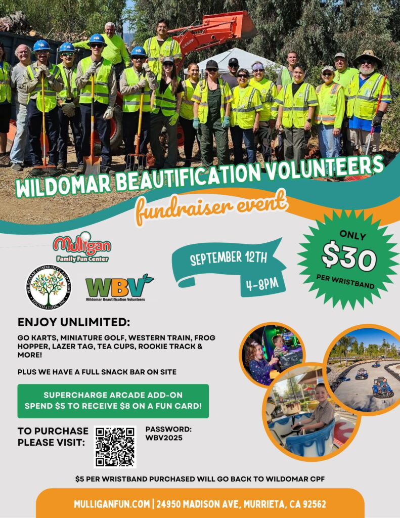 Mulligan Family Fun Center is happy to partner with The Wildomar Community & Parks Foundation, and the Wildomar Beautification Volunteers for a Family Fun Fundraiser on Friday, September 12th, 2025 from 4pm-8pm!